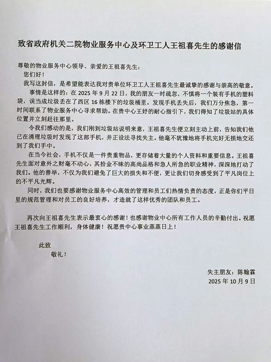 10月9日,湖南分公司省政府机关二院物业服务项目收到一封满含真挚情感的感谢信,信中不仅对保洁员王祖喜拾金不昧的行为表达诚挚谢意,更对物业服务中心的整体服务质量与管理水平给予高度认可。